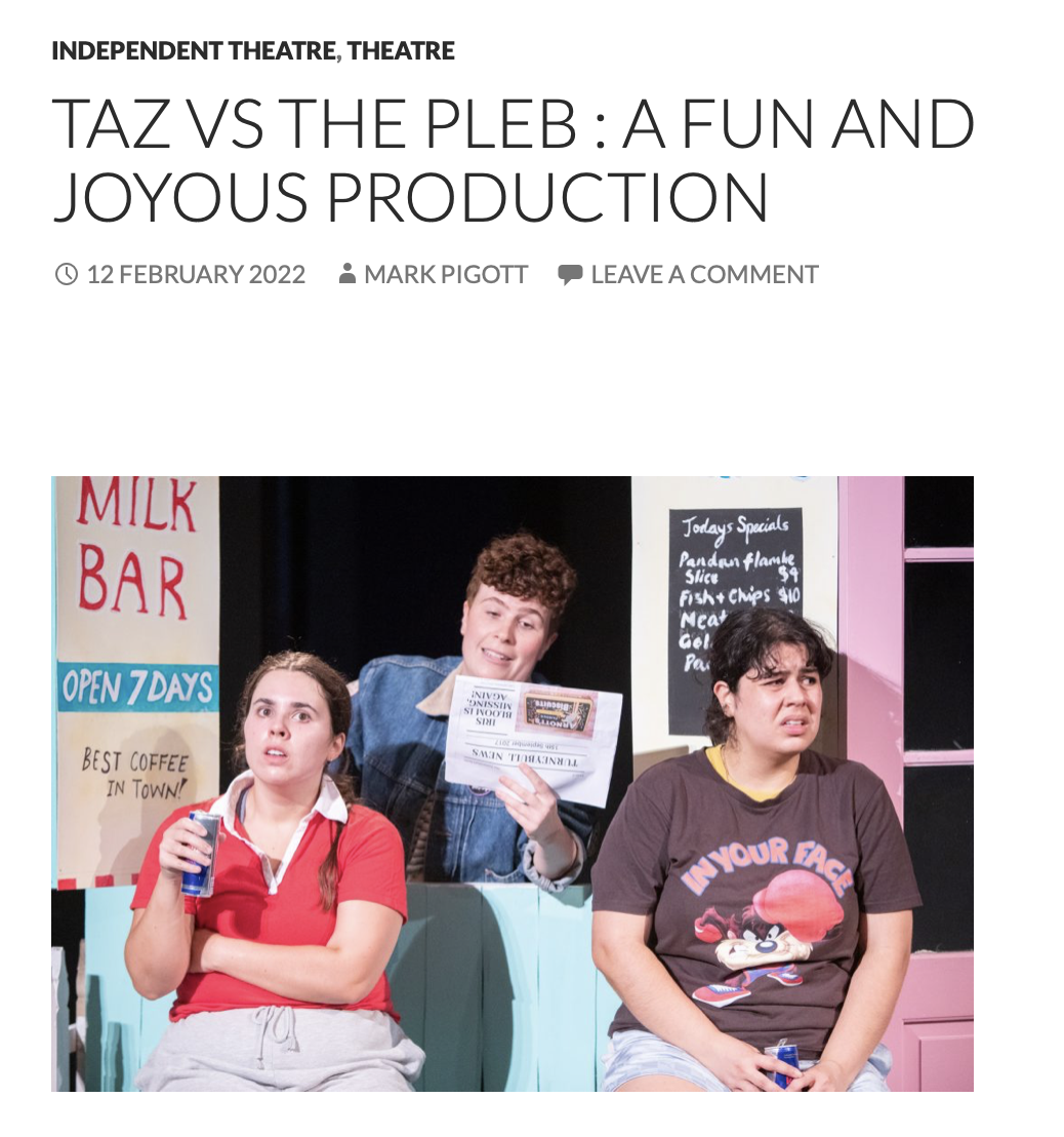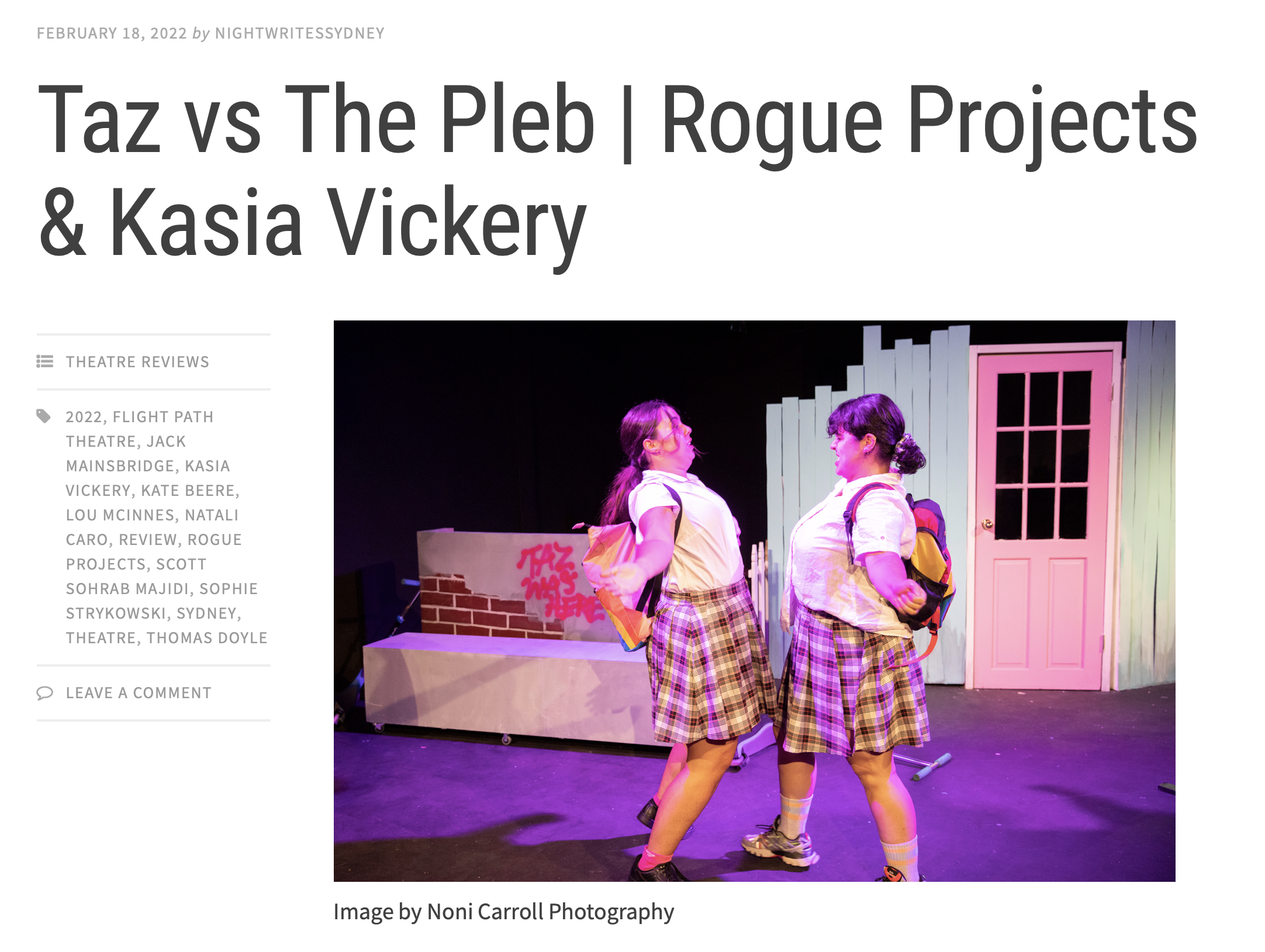 Today we talked with playwright and director Kasia Vickery about why she wrote Taz Vs the Pleb and the personal inspiration underpinning that. Make sure you book tickets if you can to see it at Flight Path Theatre in Sydney.